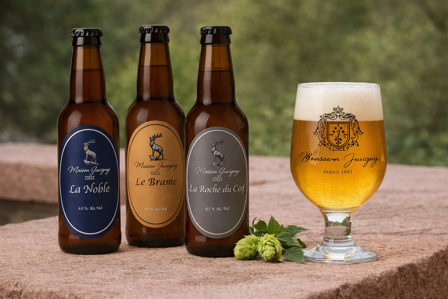 | Notre varieté | Le Brame : Bière Ambrée, La Noble : Bière Blonde, La Roche du Cerf : Biere Brune |